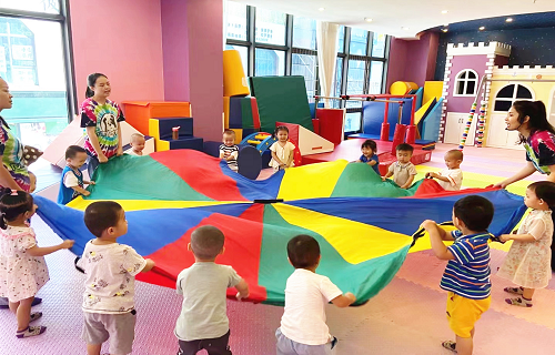 充氣滾筒和彩虹傘環(huán)節(jié),培養(yǎng)寶寶的空間感及色彩感知;